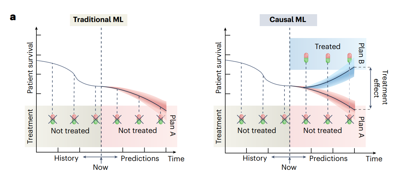 causal ML의 핵심 강점은 개별화된 치료 효과와 다양한 치료 시나리오에서 잠재적인 환자 결과 (예: 생존, 재입원, 삶의 질)에 대한 개인 맞춤형 예측을 가능하게 한다는 것이다. 이를 통해 치료가 효과적인지 또는 해로운지에 대한 세부적인 이해를 제공하여 환자 치료 의사 결정을 개별 환자 프로필에 맞게 개인화할 수 있다.