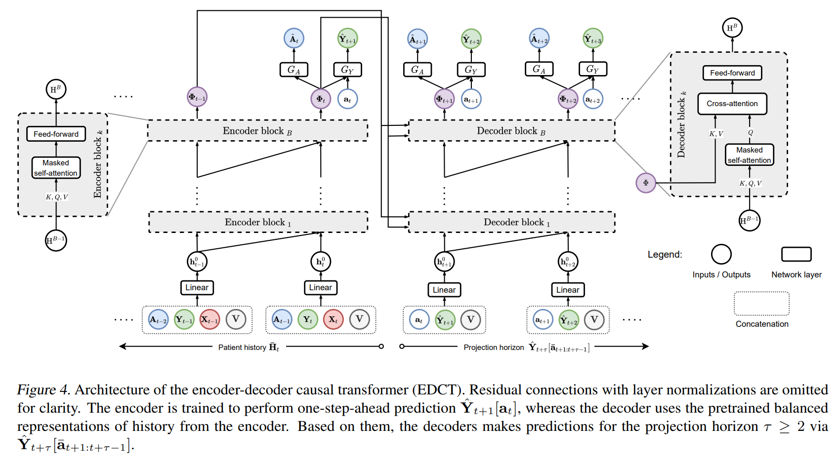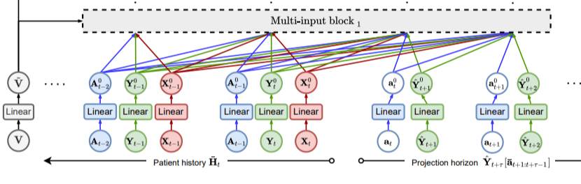 따라서, 저자는 두 treatment sequence 와 outcome sequecne를 concat한 $\overline{A}_{t-1} \cup \bar{a}_{t:t+\tau-1},\quad \overline{Y}_t \cup \hat{Y}_{t+1:t+\tau-1}$를 input을 만듦 (4) 정적 변수 V를 모든 subnetwork에 입력