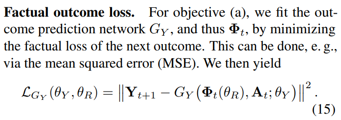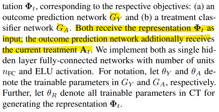 outcome prediction network $G_Y$가 representation $tilde{\Phi}_i$와 현재 treatment $A_t$를 추가로 입력 받음