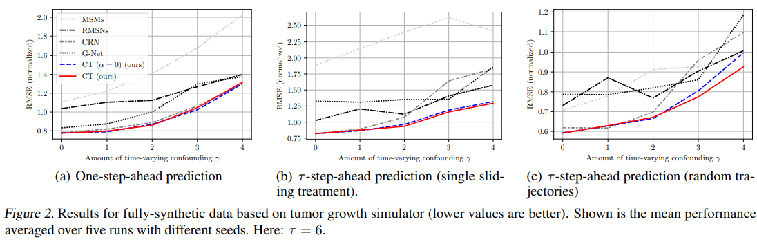 CT가 기존 최신 모델보다 성능이 좋았는데, 특히 confounding $\gamma$ 값이 클 수록, 예측해야 할 시간 간격이 클수록 그 차이가 더 크게 나타났다. CDC loss를 활성화하지 않은 파란색의 경우, 단기 예측엔 큰 영향이 없지만, 장기 예측에는 CDC loss가 중요했다.