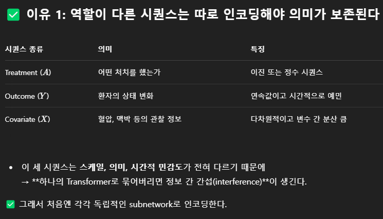 CT는 3가지 분리된 transformer subnetwork를 결합하는 multi input architecture인데, 각 subnetwork는 input으로서 다양한 sequence를 입력 받는다. (1) past time-varying covariates $\overline{X}_t$ ; (2) past outcomes $\overline{Y}_t$; past treatment before intervention \overline{A}_{t-1}