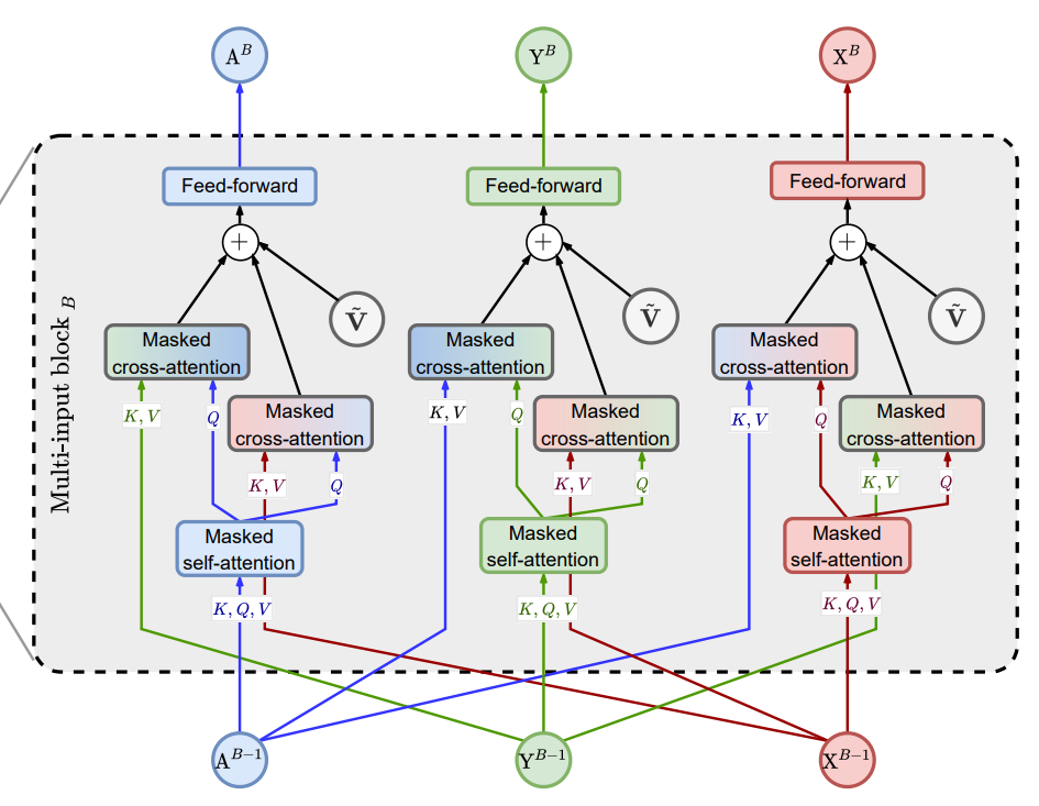 $b = 1, \ldots, B$는 서로 다른 transformer 블록 인덱스. 각 transformer 블록은 세 개의 입력 시퀀스 각각에 대해 병렬적인 hidden state 시퀀스를 입력으로 받는다. 시간 $t$에서 각 입력 시퀀스에 대응하는 hidden state는 $A_t^b$ 또는 $a_t^b$, $Y_t^b$ 또는 $\hat{Y}_t^b$, $X_t^b$로 표기한다. hidden state의 차원은 $d_h$로 정의한다. 추가적으로 각 transformer 블록은 정적 공변량의 표현 벡터 $\tilde{V}$를 추가 입력으로 받는다.