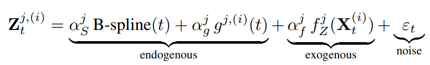 | $f_j^Z(X_t^{(i)})$ | 시계열 공변량 $Xt(i)X_t^{(i)}에 비선형 함수를 적용해 만든 외생적 영향. RFF 기반 GP 사용 |