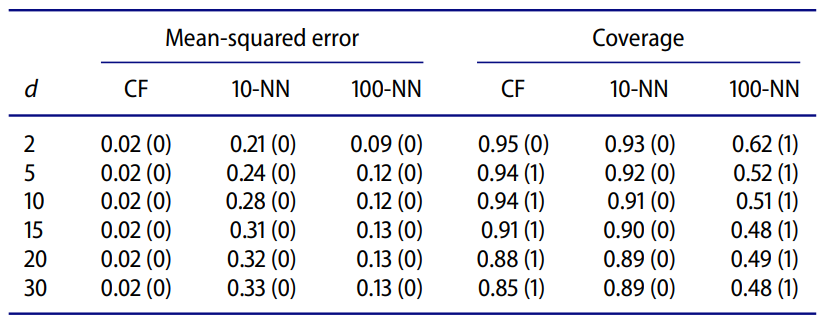 CF는 차원이 커져도 MSE가 거의 일정하게 낮았다. 그러나 NN기반 모델은 차원이 커질수록 오차가 급격히 증가했다. Coverage도 마찬가지로 CF가 좋았다.