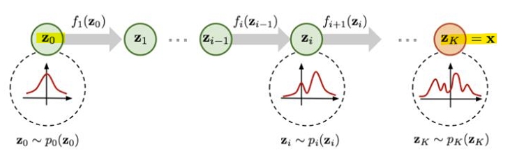 현실에서는 $x = f(z)$를 단 하나의 변환으로 구성하기 어렵기 때문에 다음처럼 여러 번의 변환 $f_1, f_2, ..., f_k$로 구성한다.
