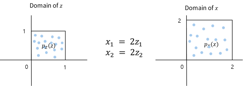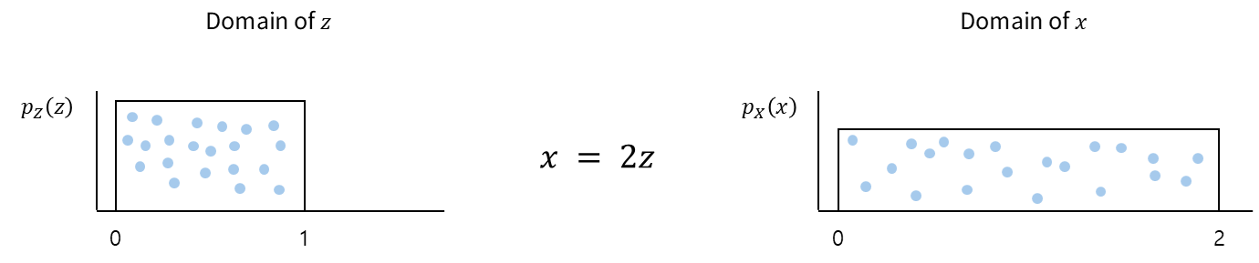 위 식에서 $p_X(x)$를 좌변에 남기고 넘기면 $p_X(x) = p_Z(z) \cdot \frac{dz}{dx}$이고, 이는 즉 $p_X(x) = p_Z(z) \cdot \frac{1}{2}$를 의미한다. 따라서 $x$의 공간(구간)이 2배 길어졌지만, x의 확률 밀도($p_X(x)$)는 z의 확률 밀도($p_Z(z)$) 보다 2배 작아졌다.