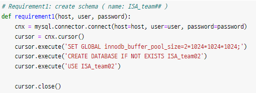 (R2-1) 사이트 A의 데이터를 활용하기에 앞서 이를 MySQL 상에 저장해야 한다. 이를 위해 먼저 ISA_team##의 이름을 가지는 schema를 생성해야 한다. 예를 들면, 1조의 schema 명은ISA_team01이다. 이 때 schema가 존재할 경우 생성 과정을 다시 수행하지 않아야 한다.