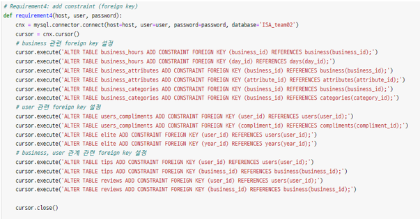 테이블들은 모두 primary key와 foreign key에 해당되는 column들이 모두 포함되어 있고, primary key의 경우는 미리 requirement2-2에서 제약조건을 설정해주었다. 나머지 foreign key에 대한 제약조건을 반영해주기 위해 위와 같은 방식으로 ALTER를 이용하여 지정하였다.