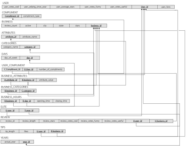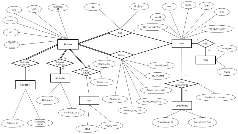 -> 요일 정보는 days 라는 강한 enity type으로 설정하였고 요일 정보와 연관이 있는 것은 사업체 이므로 Business와 days간의 Business hours라는 relation을 두고, Business hours의 attribute로 opening_time, closing_time으로 두어 개장시간과 폐장시간도 저장하고 있다는 것을 표현, 연도 정보는 years라는 강한 enity type으로 설정하였고 연도 정보와 연관이 있는 것은 사용자 이므로 User와 years 간의 elite라는 relation을 두어 고객의 엘리트 선정 시점 정보도 저장하고 있다는 것을 표현하음.