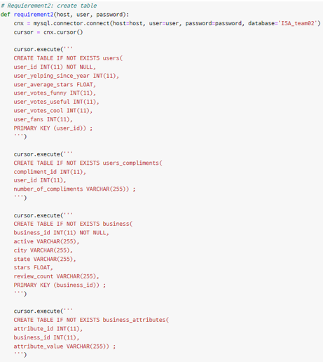 모든 테이블들은 IF NOT EXISTS를 통해서 테이블이 존재한다면 다시 생성되지 않도록 하였다. 또한, 조건에 알맞게 숫자형의 경우는 INT(11)로, 문자형의 경우에는 VARCHAR(255)를 이용해 생성하였다. 불러오는 csv파일이 14개에 대응되는 테이블에 맞추어서 14개의 테이블을 생성하였고, 테이블을 생성할 때 Primary key에 대한 제약조건만 설정하고 foreign key에 대한 제약조건 바로 설정하지 않았다.